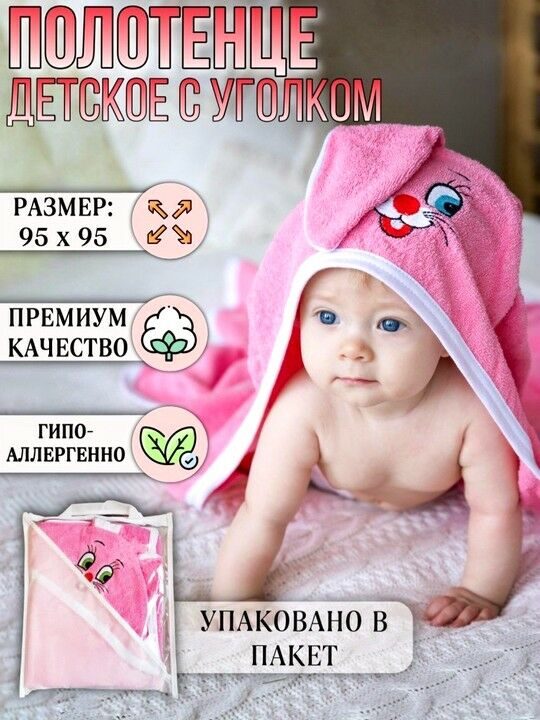 Уголок махровый детский "Ушастик"-РОЗОВЫЙ 95*95 см. хлопок 100%