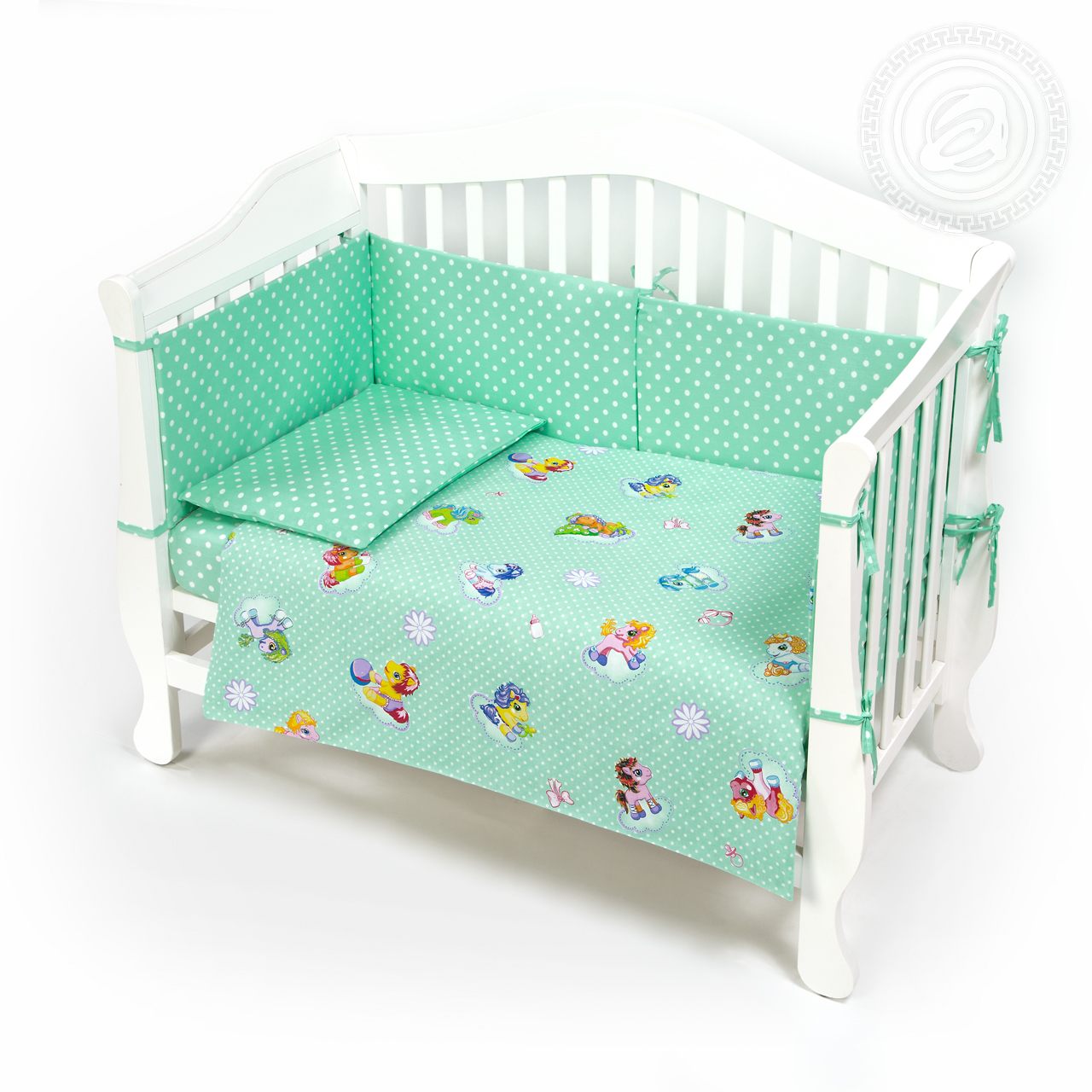 Набор в детскую кроватку «Бусинка» из поплина идеально подходит для малышей с первых дней жизни. Хлопковая ткань гипоаллергенная, мягкая, практичная. Дизайн нежный и волшебный. По сказочному зеленому лугу беззаботно скачут разноцветные пони.