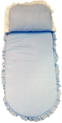 Набор в коляску включает 2 предмета: матрац и подушку с кружевной оборкой.