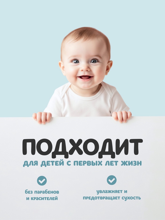 Способ применения: добавьте на ладони несколько капель крем-мыла и массирующими движениями нанесите его на влажную кожу малыша.
