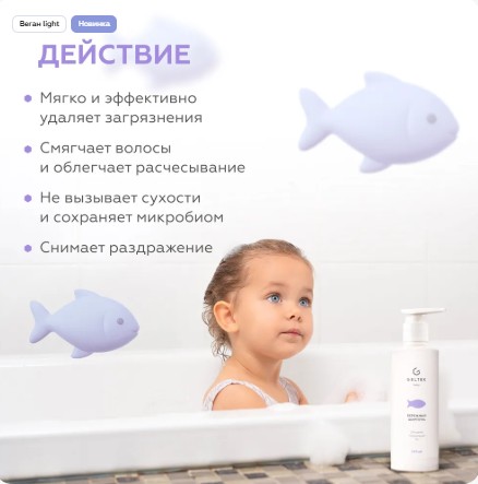 Более 85% компонентов шампуня используются в пищевой промышленности, а мягкие ПАВ имеют растительное происхождение, что гарантирует безопасность и деликатное действие.