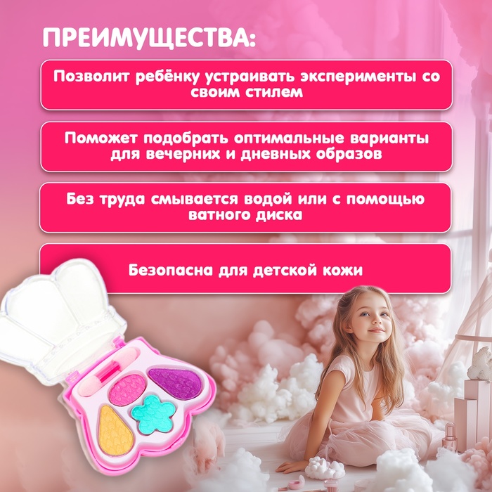 Детская косметика позволит ребёнку устраивать эксперименты со своим стилем. Набор поможет девочке подобрать оптимальные варианты для вечерних и дневных образов. Косметика без труда смывается водой или с помощью ватного диска и безопасна для детской кожи.