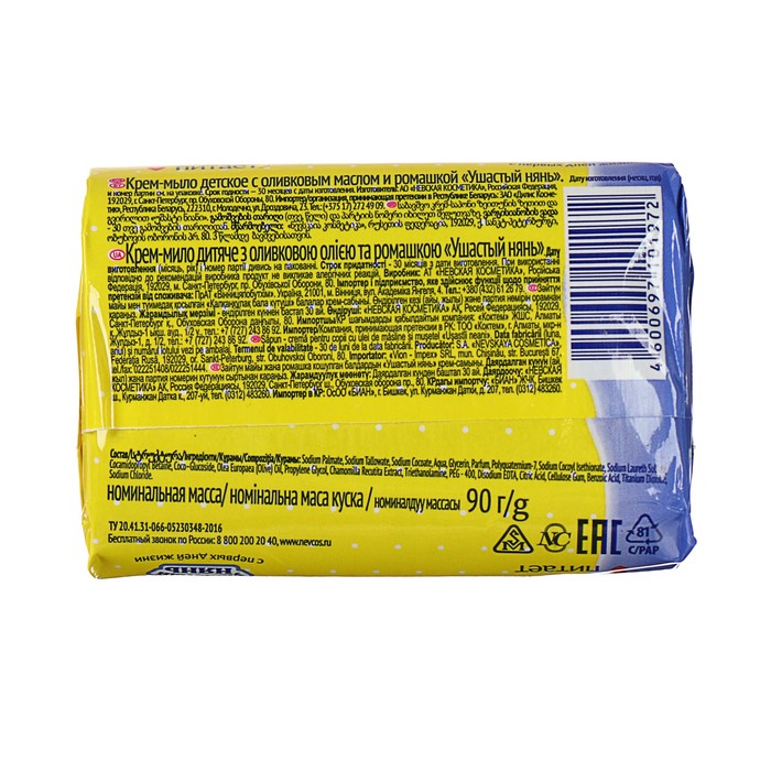 Детское крем-мыло Ушастый нянь, с оливковым маслом и ромашкой, 90 г
