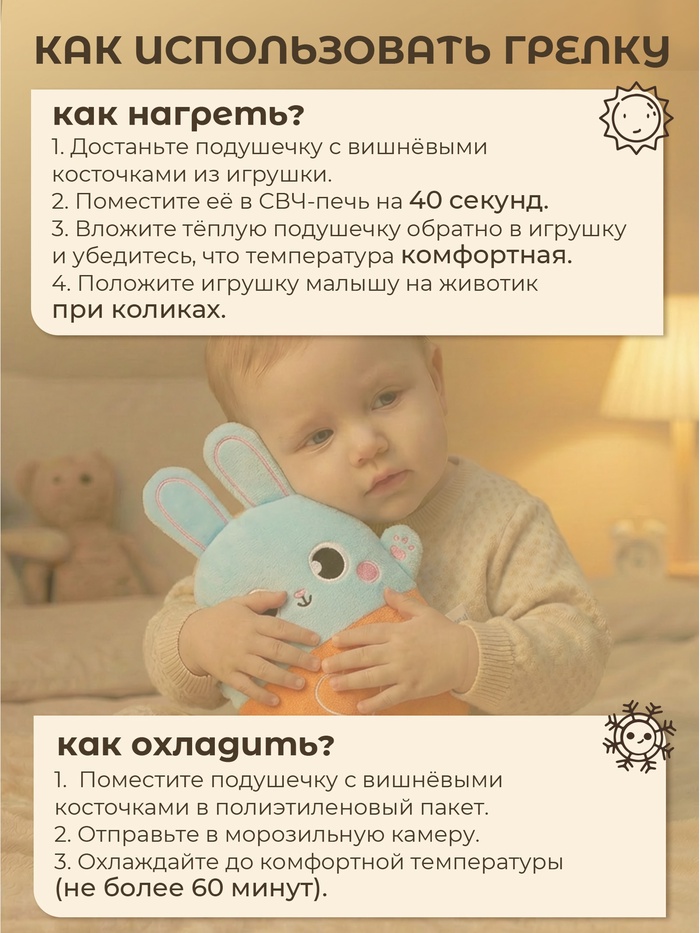 Согревает. Как нагреть? Достаньте подушечку с вишневыми косточками из игрушки и нагрейте в СВЧ печи 40 секунд. Затем вложите подушечку в игрушку и убедитесь, что температура комфортная для вас и вашего ребёнка. Положите теплую игрушку малышу на животик при коликах.
