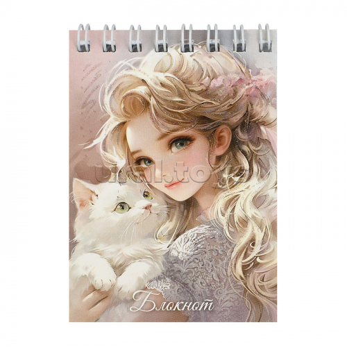 Блокнот 40л, А7 "Блондинка с котом" 60 г/м², клетка, гребень по кор стороне