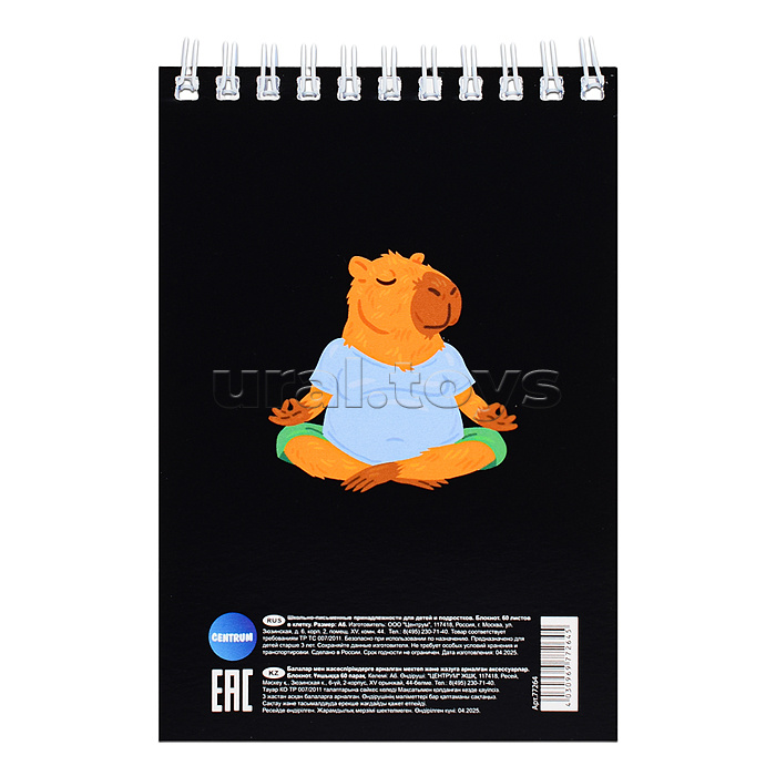 Блокнот "Капибара" формат А6, 60 листов, на гребне, целлюлозный картон