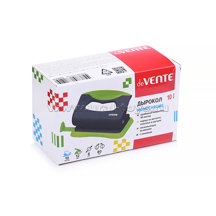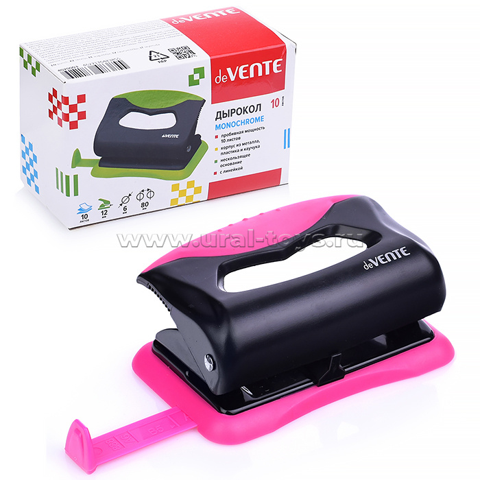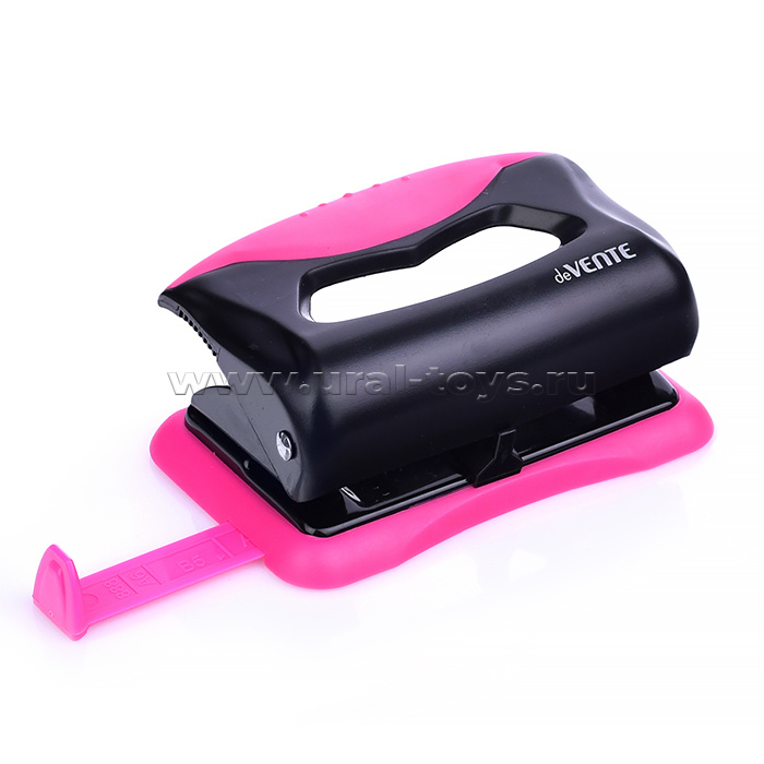 Дырокол "MonoChrome" (10 листов) пластиковый с каучуковой вставкой, с линейкой, в картонной коробке, черный с неоновым розовым