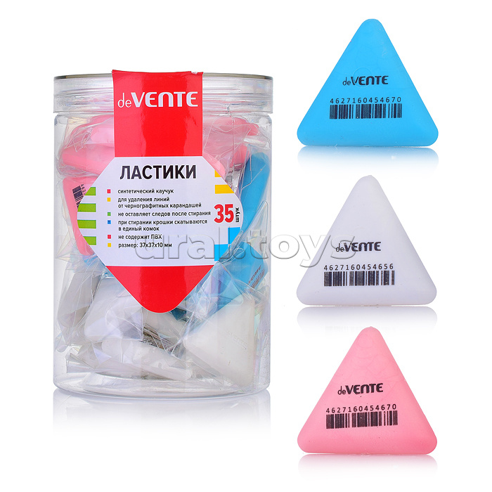 Ластик "Trio" синтетический каучук, треугольный цветной, 37x37x10 мм, dust-free, в индивидуальной упаковке с штрих кодом, в пластиковой банке