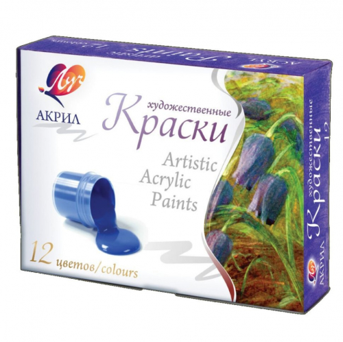 Краски акриловые художественные 12 цв. (белая, алая, желтая, голубая, изумрудная, черная, коричневая, рубиновая, сиреневая, оранжевая, зеленая светлая, фиолетовая). После высыхания образуют несмываемую плёнку. Красочный слой эластичен, прочен и долговечен. При высыхании имеет глянцевую поверхность. Изготовитель может вносить во внешний вид изделия изменения, которые не влияют на качество продукции.