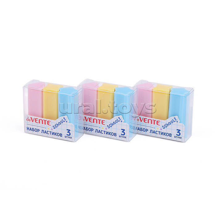 Набор ластиков "School" 3 шт, синтетический (ECO-PVC) цветные, 3 разные формы (трехгранник, четырехгранник, звезда) длина ластика 45 мм, диаметр ластика 12-18 мм, dust-free, в пластиковой коробке, с индивидуальной маркировкой