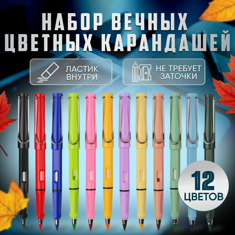 Набор из 12 цветных вечных карандашей, которые не требуют заточки.