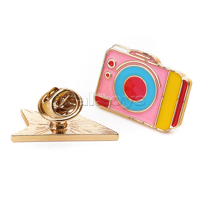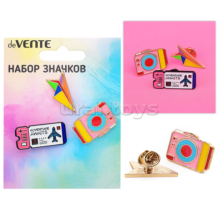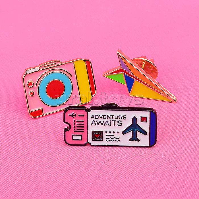 Набор значков "Adventure awaits" эмалированные, размер изделий: билетик 2,8x1 см, самолетик 2,75x1,5 см, камера 2,49x1,8 см, на карточке 7,0x9,5 см с пластиковым пакетом