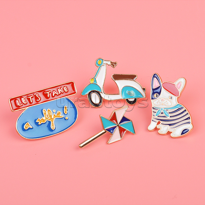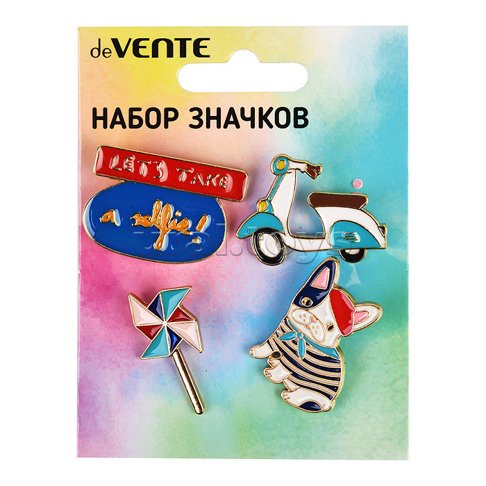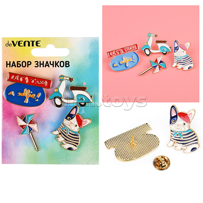 Набор значков "Chic Girl" эмалированные, размер изделий: Let's take a selfie 3,3x2,3 см, щенок 2x3 см, игрушка 1,6x3 см, скутер 3,4x2,6 см на карточке 7,0x9,5 см с пластиковым пакетом