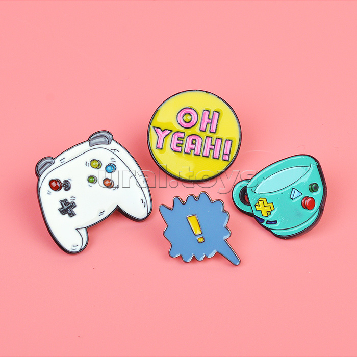 Набор значков "GAME" эмалированные, размер изделий: игровой планшет 3x2,6 см, круглый значок 2,3 см, восклицательный знак 1,8x2,5 см, чашка 2,6x2,2 см на карточке 7,0x9,5 см с пластиковым пакетом
