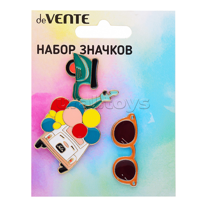 Набор значков "Holidays in Italy" эмалированные, размер изделий: автобус 3,2x3,5 см, скутер 3,4x2,8 см, очки 3,8x1,3 см, на карточке 7,0x9,5 см с пластиковым пакетом
