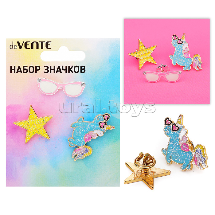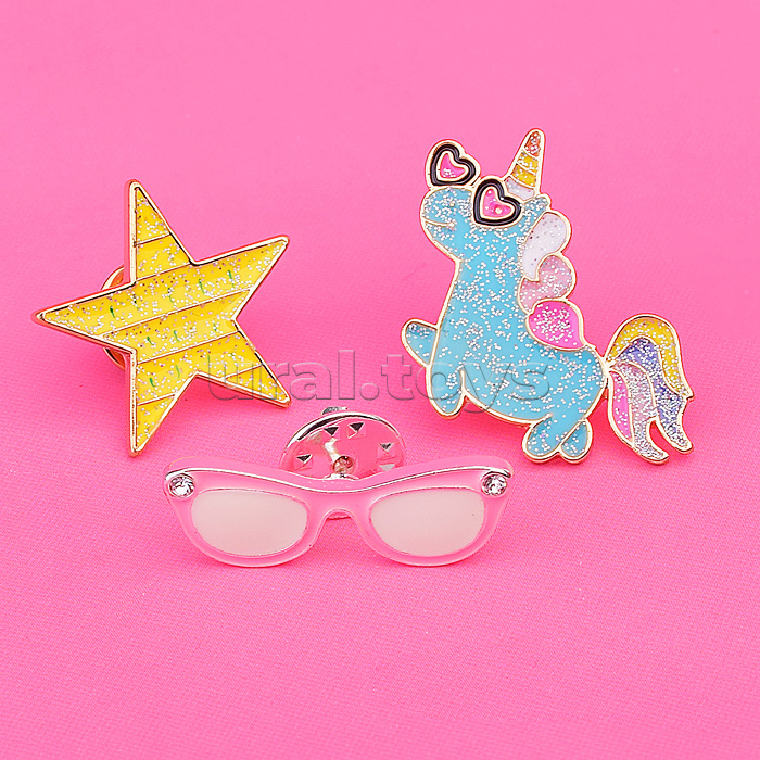 Набор значков "I am a star!" эмалированные, размер изделий: единорог 2,8x3 см, звездочка 2,5x2,5 см, очки 3,1x1 см, на карточке 7,0x9,5 см с пластиковым пакетом
