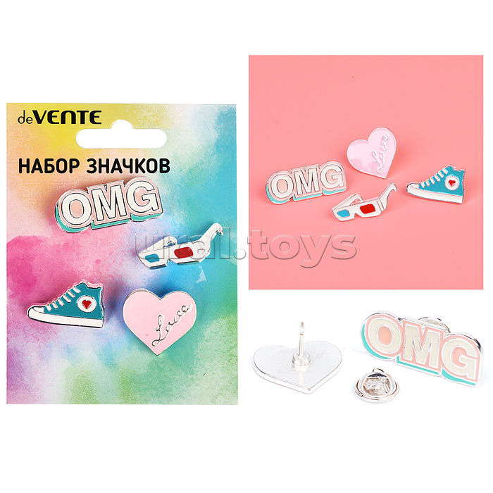 Набор значков "Selfie&Shoes" эмалированные, размер изделий: очки 2,2x1,3 см, OMG 3,4x1,4 см, кеда2,4x1,5 см, сердце 2,3x2 см на карточке 7,0x9,5 см с пластиковым пакетом