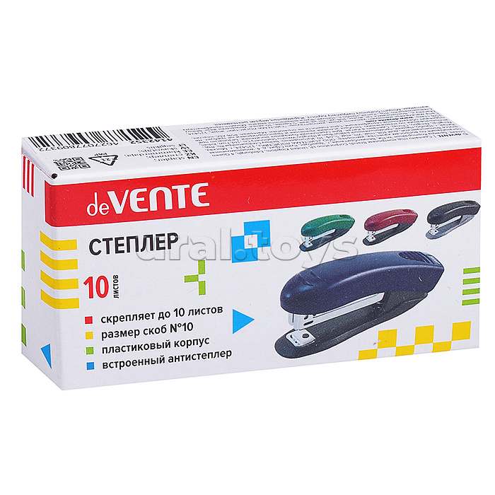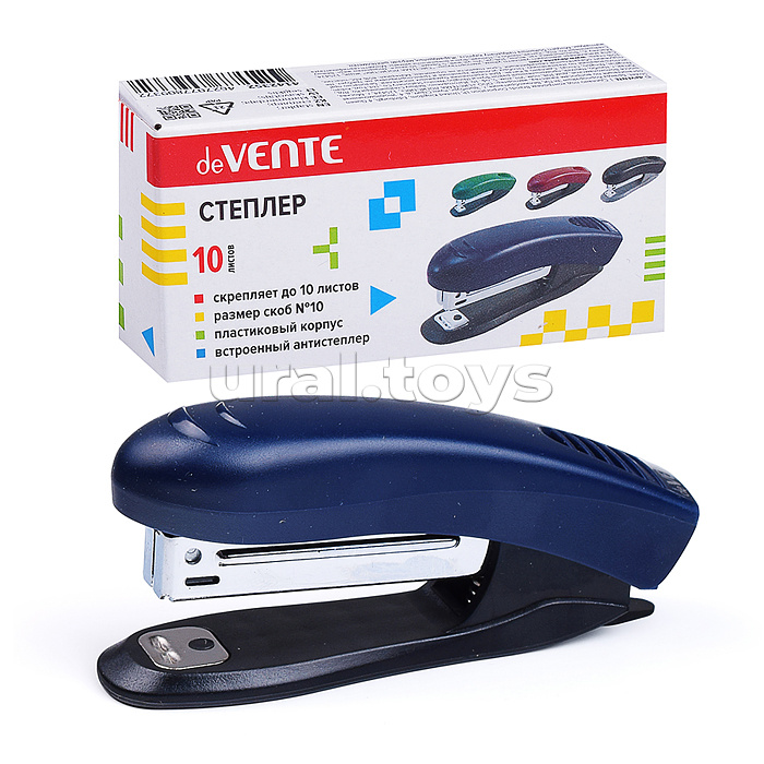 Степлер "Stripe" № 10 (мощность 10 листов, глубина скрепления 43 мм) пластиковый, со встроенным антистеплером, в картонной коробке, синий