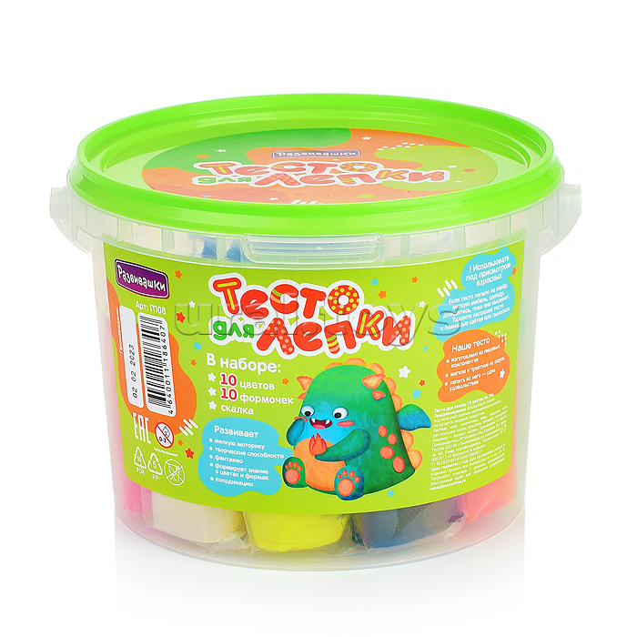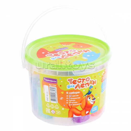 Тесто для лепки 10 цветов по 70гр +10 формочек, скалка в ведре
