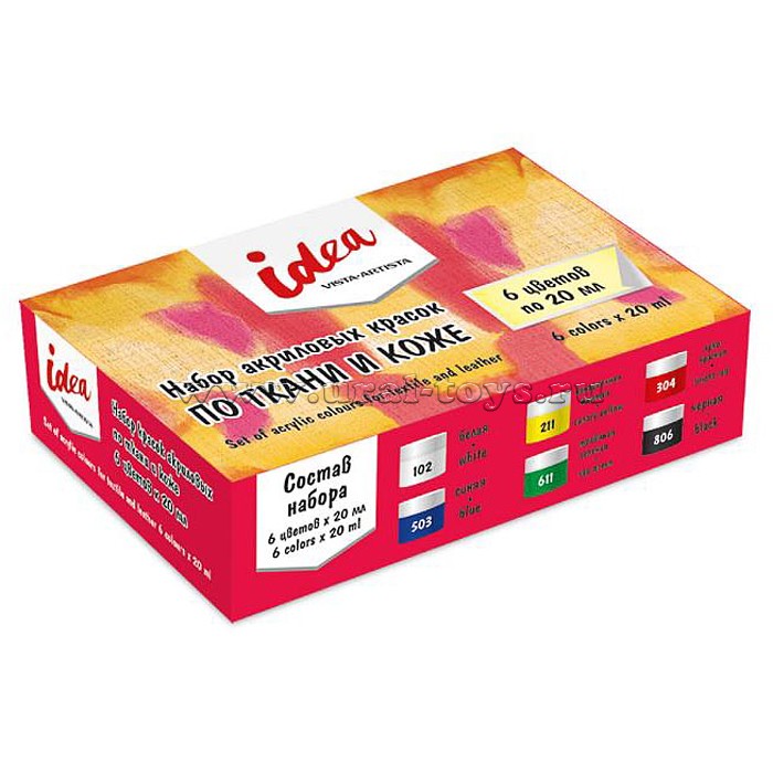 Акриловые краски по ткани и коже Vista-Artista idea предназначены для росписи натуральных тканей и кожи. Густая консистенция красок делает их удобными для использования в различных техниках, особенно в трафаретной, краски не затекают по край трафарета и не портят рисунок. Широкая цветовая палитра основных и модных оттенков, позволит воплотить в жизнь самые смелые идеи. • Набор красок по ткани и коже 6 цветов в баночках по 20 мл. • Цвета набора: 102 - Белая, 211 - Канареечная жёлтая, 322 - Красная яркая, 516 - Синяя, 612 - Зелёная, 806 - Чёрная. • Состав красок: стирол-акриловая дисперсия, пигменты, наполнители, добавки, вода. • Упаковка: картонная коробка. • Хранить при температуре не ниже +5 градусов С. • Соответствует требованиям безопасности продукции.