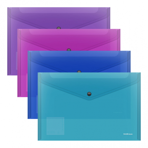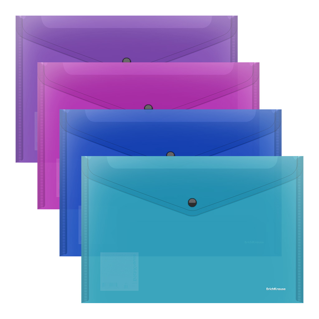 Папка-конверт на кнопке пластиковая ErichKrause® Fizzy Vivid, полупрозрачная, A4, ассорти (в пакете по 12 шт.)