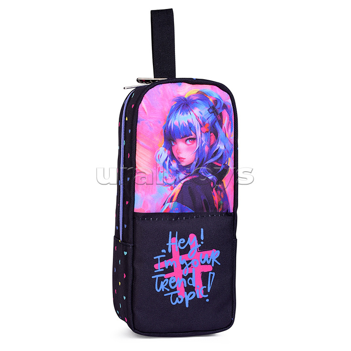 Пенал "Hey Girl" 21x9x6 см, прямоугольный вертикальный для 60 предметов, плотный износостойкий полиэстер с водоотталкивающей пропиткой, на молнии, фиксация в открытом виде магнитом, с каучуковой аппликацией, с петлей