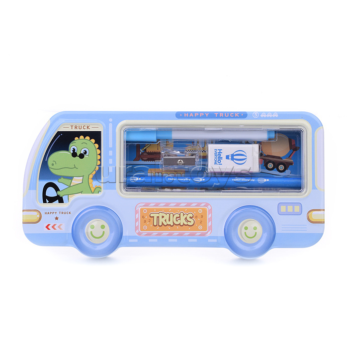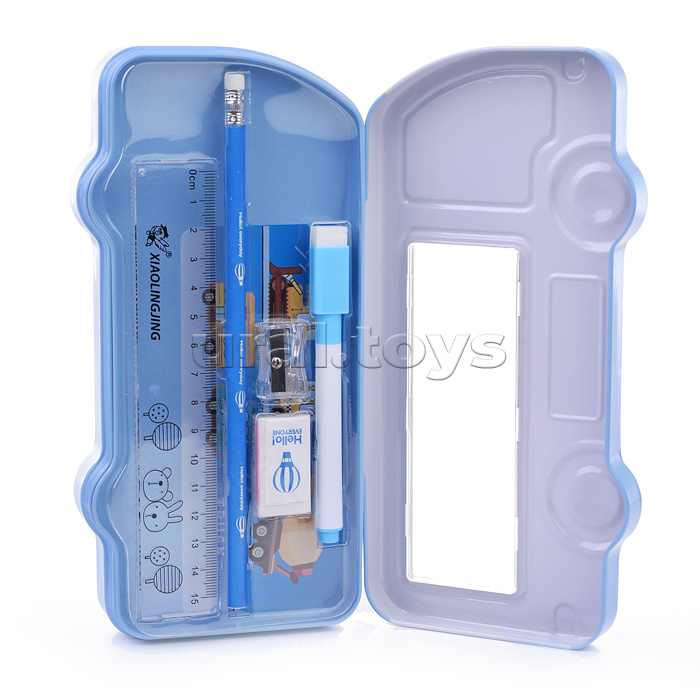 Пенал металлический машина, 2 отдел. Alingar линейка 15 см, 1 ч/г каран, 1 точ, 1 ласт, 1 флом, 95 х 210 мм, "Машина. Дино за рулем", голубой