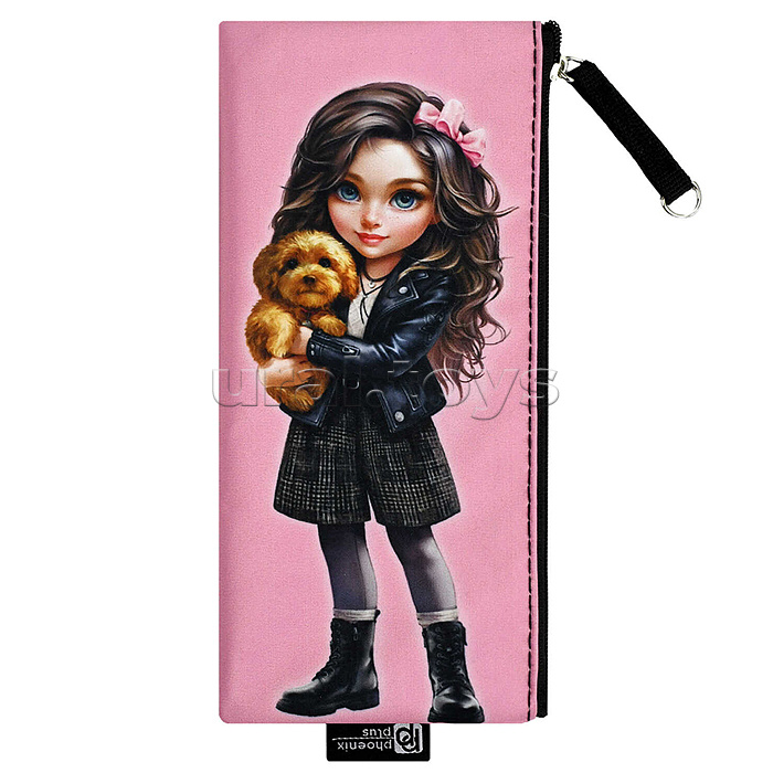 Пенал школьный "Брюнетка с собачкой" (без наполнения, 19.5х9 см, микрофибра на ПВХ-основе)