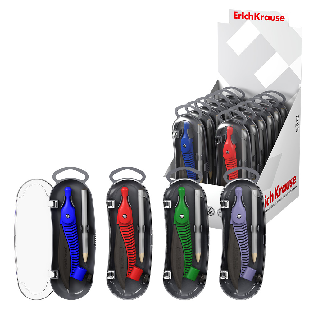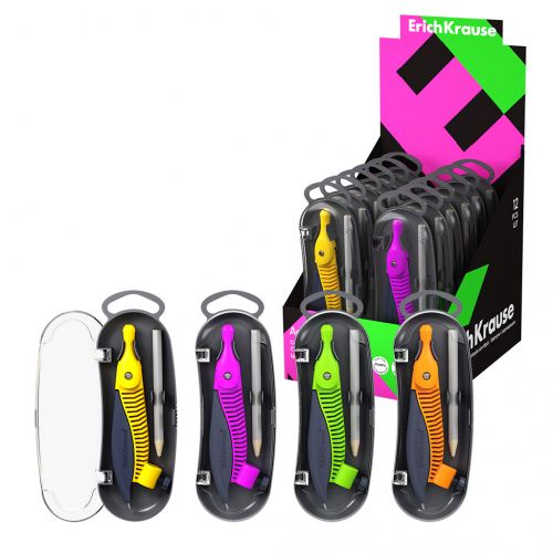 Циркуль пластиковый ErichKrause Classic, 122мм, с карандашом, пенал, ассорти (в коробке-дисплее по 12 шт)