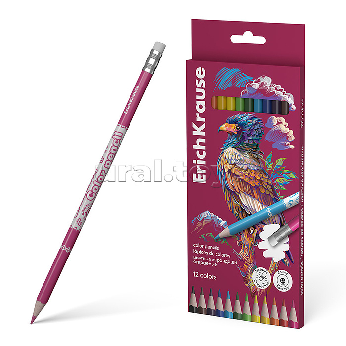 Карандаши цветные деревянные Safari круглые стираемые с ластиком, грифель 3,3 мм, 12 цветов