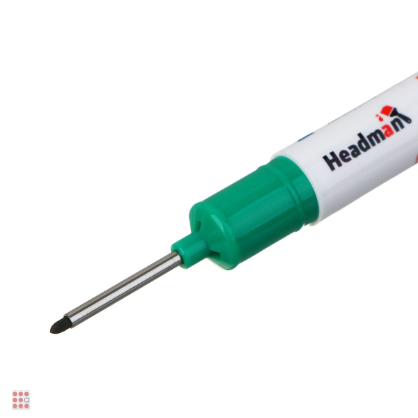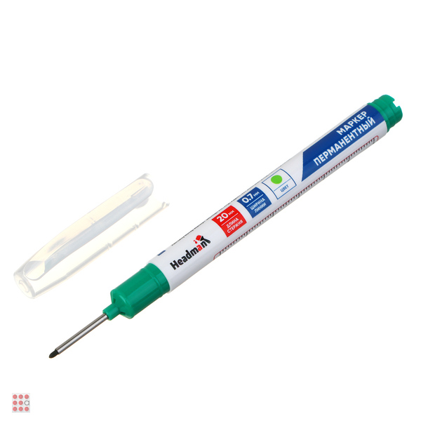 Перманентный маркер для отверстий ЕРМАК зеленый оснащен удлиненным наконечником. Это позволяет наносить пометки сквозь небольшие отверстия. Перманентный маркер пишет практически на любой поверхности, применяется в различных сферах, где требуется разметить отверстие или сделать пометку сквозь небольшое отверстие. Используется для маркировки заготовок из камня, стекла, металла, пластика и других материалов.