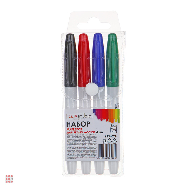 Набор маркеров ClipStudio для белых досок, 4 цвета. Чернила стираются с магнитно-маркерной доски сухой тряпочкой. Подходит для письма на любой гладкой поверхности. Светостойкие чернила, на спиртовой основе. Пулевидный наконечник, толщина линии 3 мм. Хранить в горизонтальном положении.