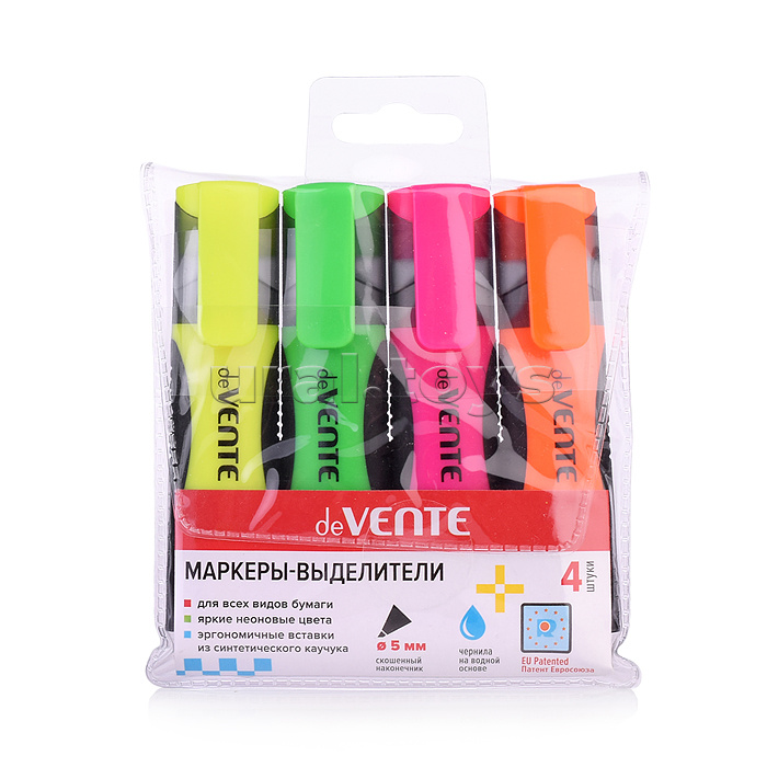 Набор маркеров-выделителей (04 цв - желт, зел, оран, роз) плоский корпус с каучуковыми вставками, с клипом, скошенный наконечник, ширина линии 1-5 мм
