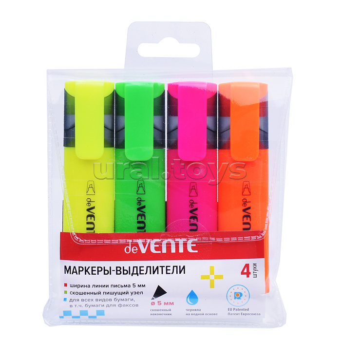 Набор маркеров-выделителей (04 цв - желт, зел, оран, роз) плоский корпус, скошенный наконечник, ширина линии 1-5 мм, в пластиковом блистере