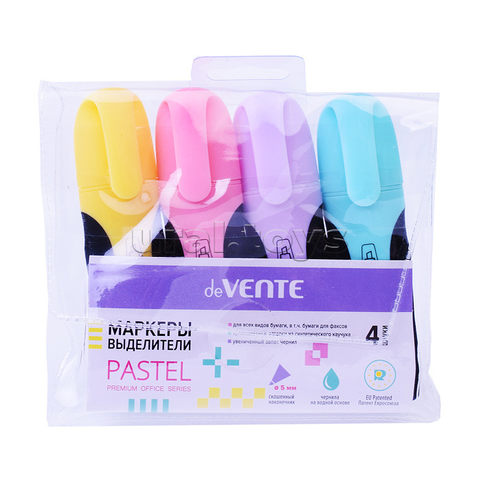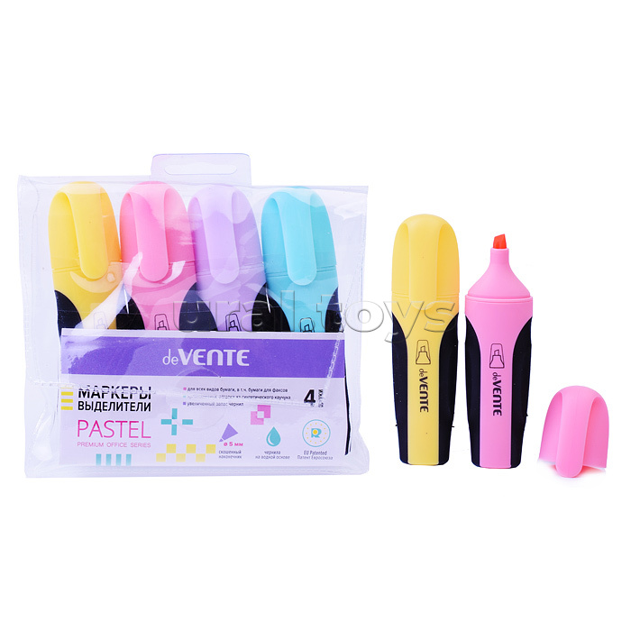 Набор маркеров-выделителей "Pastel" (04 цв - пастельные желт, роз, фиал, бирюз) плоский корпус, скошенный наконечник, ширина линии 1-5 мм, в пластиковом блистере