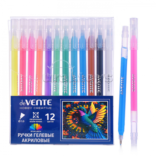 Набор ручек гелевых акриловых "Hobby creative" 12 шт, 12 цветов, d=1 мм, прозрачно-матовый круглый корпус, колпачок с клипом, увеличенный запас чернил, специальные акриловые чернила c высокой яркостью на черной бумаге, в пластиковой коробке