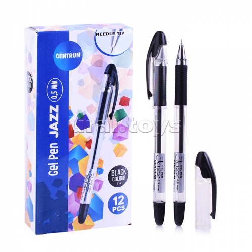 12 шт. Ручка гелевая Centrum JAZZ для ценителей простоты и функциональности. Модель сочетает в себе лаконичный дизайн и исключительное удобство. Ручка представлена в прозрачном пластиковом корпусе. Исключительное качество гарантирует длительный срок эксплуатации, обеспечивающее комфортное и надежное письмо. Металлический наконечник не царапает бумагу, оставляет ровную четкую линию диаметром, 0,5мм. Чернила черного цвета равномерно распределяются по поверхности, мгновенно высыхая и не размазываясь.