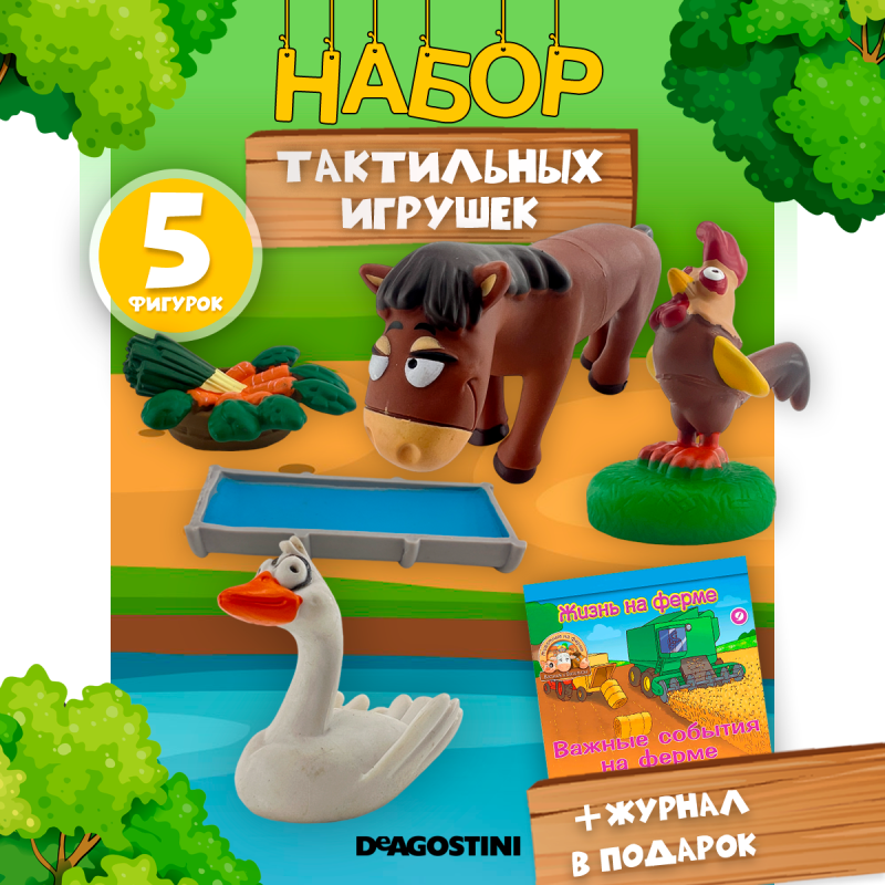В комплекте вы получите журнал и набор игрушек: кобыла Улыбка, Петух Барон, морковка, порей, поилка, лебедь (без тележки). Симпатичные персонажи, забавные животные и детали для строительства твоей собственной фермы в новой коллекции «Животные на Ферме Василия и Василисы». Издательство ДеАгостини.С каждым выпуском коллекции твоя ферма будет пополняться новыми животными и различными постройками, а также огородом, прудом и другими обязательными для настоящей фермы деталями. Собери ферму со всеми её обитателями!Вместе с коллекцией забавных фигурок, созданных на основе рисунков из журнала, ты сможешь собрать свою собственную ферму с людьми, животными, обстановкой и даже необходимыми хозяйственными инструментами. Наши симпатичные персонажи, фермер Василий и его жена Василиса, а также собака Полкан, корова Зорька, бык Огонек, ослик Бублик и многие другие проводят тебя в познавательный мир интересных открытий и сюрпризов!Журнал Животные на Ферме расскажет об интересных фактах и увлекательных историях из жизни животных. Он красочно иллюстрирован тематическими картинками и содержит ответы на все вопросы, связанные с фермерской жизнью.