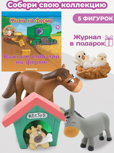 В комплекте вы получите журнал и набор игрушек: рабочий фермы, садовые инструменты, петух Барон, морковка, порей, поилка, павлин Клементи, ягненок Беби. Симпатичные персонажи, забавные животные и детали для строительства твоей собственной фермы в новой коллекции «Животные на Ферме Василия и Василисы». Издательство ДеАгостини.С каждым выпуском коллекции твоя ферма будет пополняться новыми животными и различными постройками, а также огородом, прудом и другими обязательными для настоящей фермы деталями. Собери ферму со всеми её обитателями!Вместе с коллекцией забавных фигурок, созданных на основе рисунков из журнала, ты сможешь собрать свою собственную ферму с людьми, животными, обстановкой и даже необходимыми хозяйственными инструментами. Наши симпатичные персонажи, фермер Василий и его жена Василиса, а также собака Полкан, корова Зорька, бык Огонек, ослик Бублик и многие другие проводят тебя в познавательный мир интересных открытий и сюрпризов!Журнал Животные на Ферме расскажет об интересных фактах и увлекательных историях из жизни животных. Он красочно иллюстрирован тематическими картинками и содержит ответы на все вопросы, связанные с фермерской жизнью.