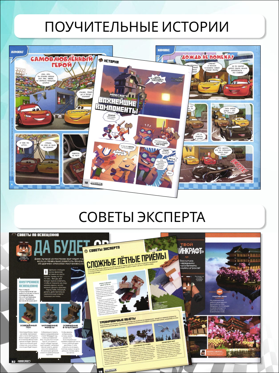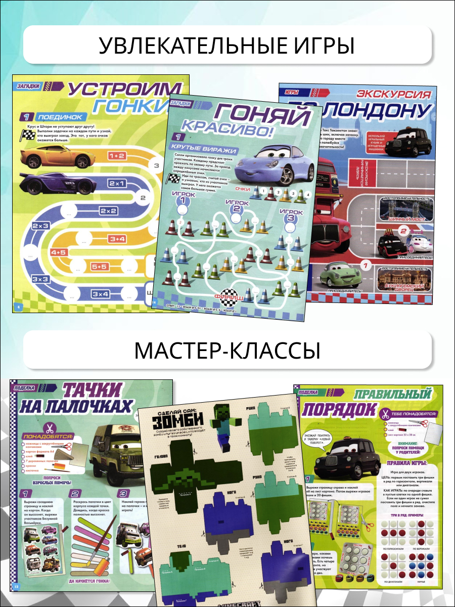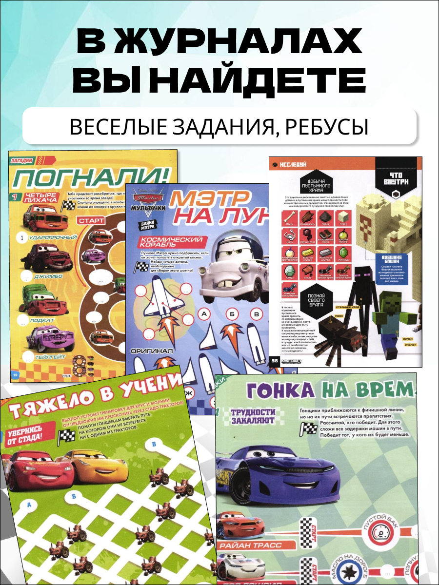 Первоклассник 7,8 лет оценит школьный раздел с головоломками и ходилками, а малыши — крупные картинки и простые загадки. Девочки 4,5,6 лет в восторге от страниц с Винкс, Мой маленький пони, LOL и Magiki, а мальчики в возрасте 9 – 12 — от приключений Тачек и Лего Ниндзяго, Hot Wheels. В некоторых комплектах сюрприз: набор наклеек для оформления журнала или дневника.
