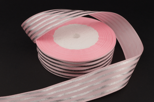 Купить атласную ленту нежно-розового цвета с рисунком "Полоса" (серебро) высокого качества по оптовым ценам вы можете в нашем интернет-магазине.