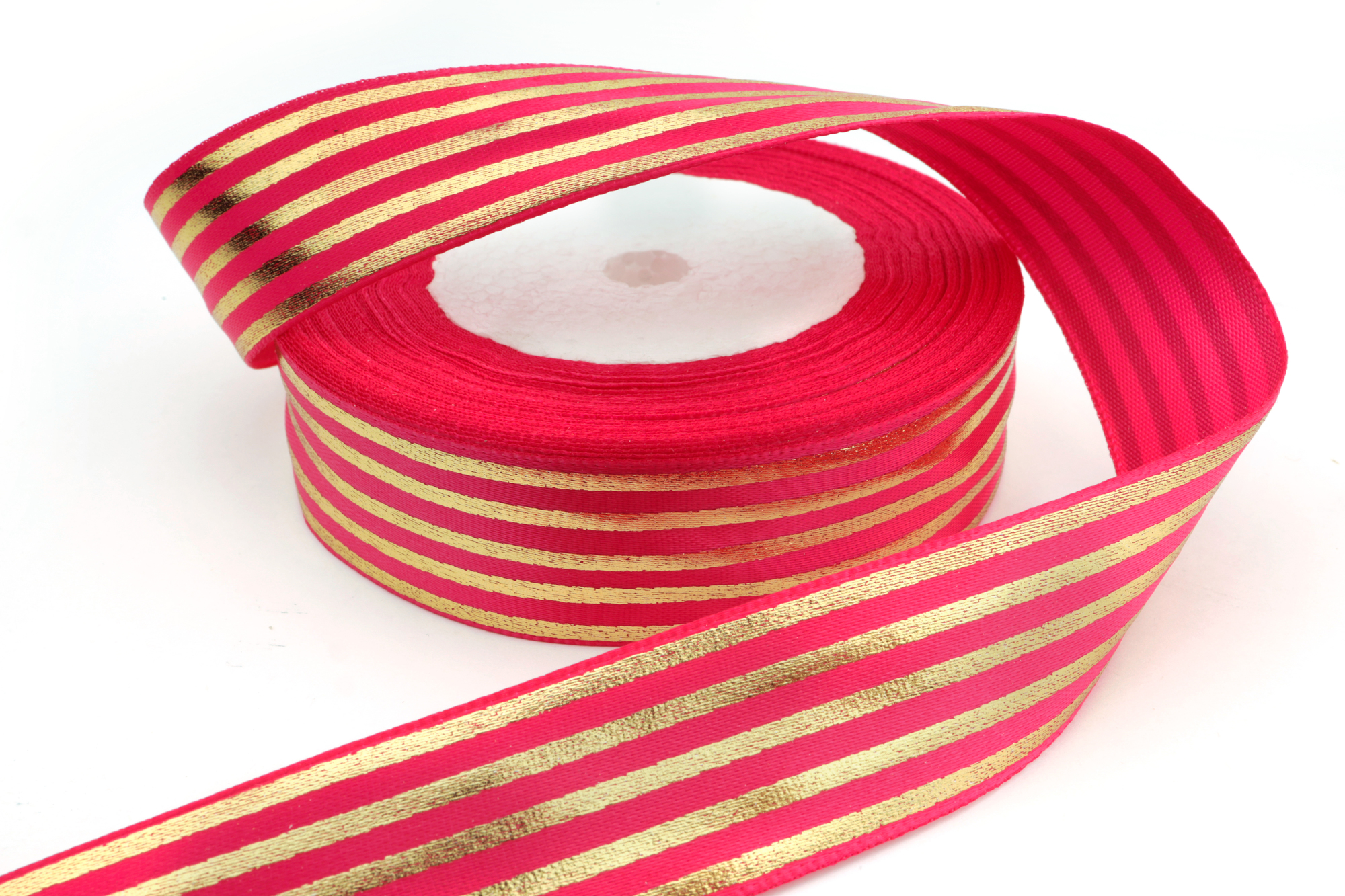 Купить атласную ленту ярко-розового цвета с рисунком "Полоса" (золото) Вы можете в нашем интернет-магазине по доступной цене и с удобной доставкой.