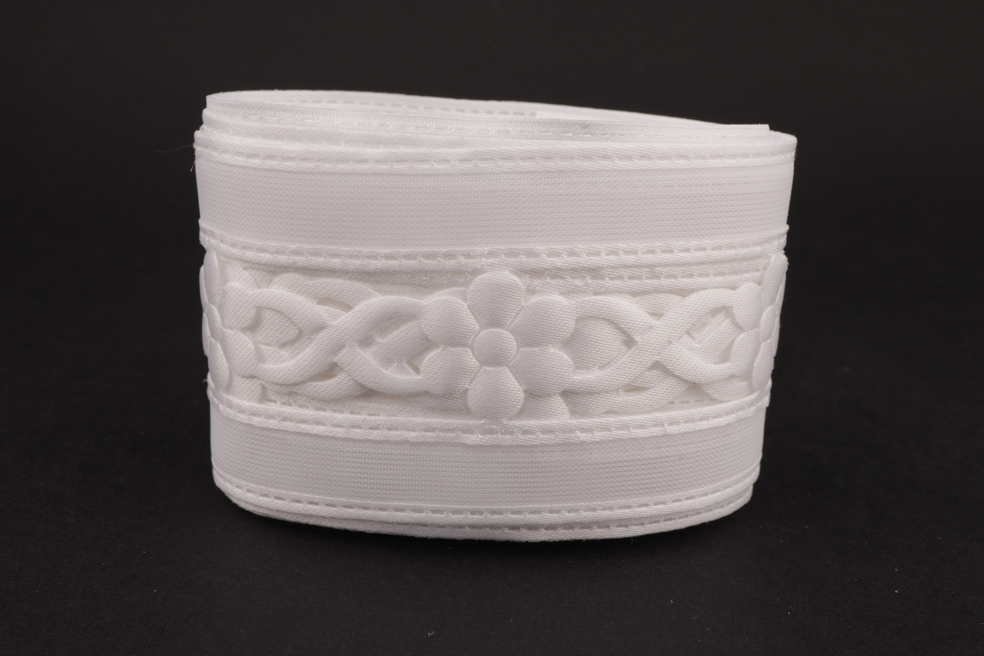 Купить декоративную ленту белого цвета с атласной перфорацией "Цветы" и капроновой вставкой по краям, по оптовым ценам с доставкой удобным для вас способом, Вам поможет наш интернет-магазин.