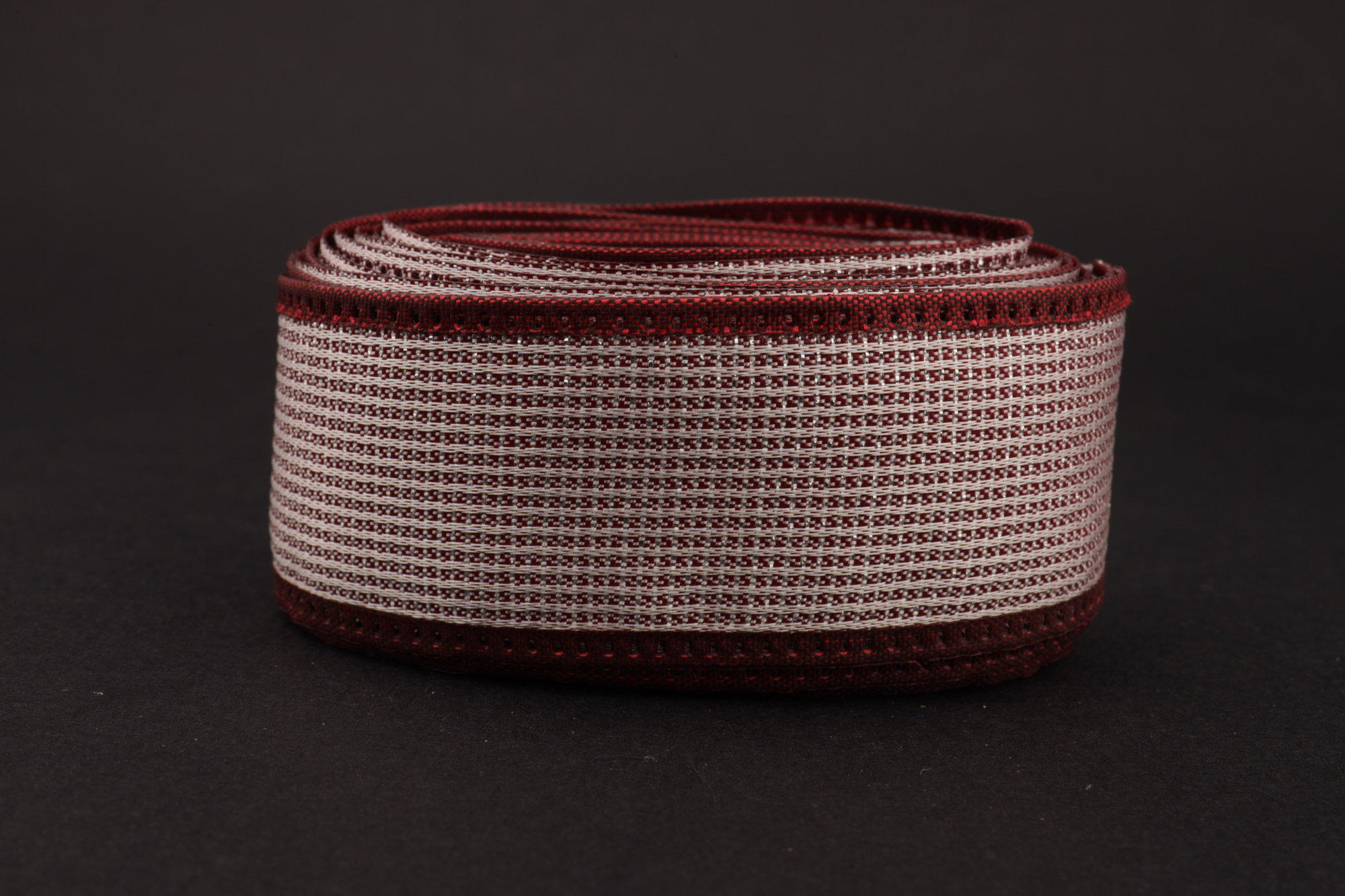 Купить декоративную ленту бордового цвета с белой нитью и люрексом серебро, по оптовой цене  и сервисом высочайшего уровня всегда можно в магазине lentoff.ru.