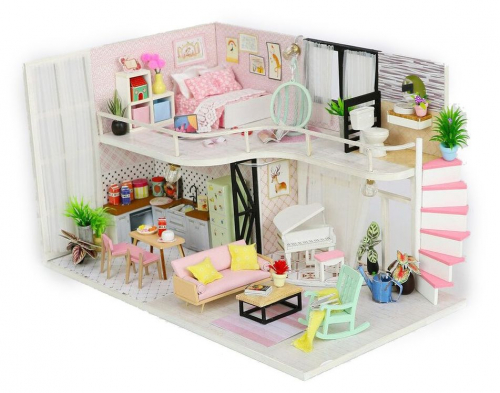 Румбокс Diy House "Розовый лофт" - конструктор миниатюрной квартиры с невероятно реалистичным интерьером, продуманным до мельчайших подробностей. Благодаря сочетанию белого цвета и целой гамме розовых оттенков, интерьер румбокса получается необычайно нежным и воздушным. Очарования и уюта добавляют белоснежный рояль, кресло-качалка с пледом и книгой, лёгкое, почти невесомое подвесное кресло в спальне, комнатные растения и, конечно, мягкое освещение всего румбокса.