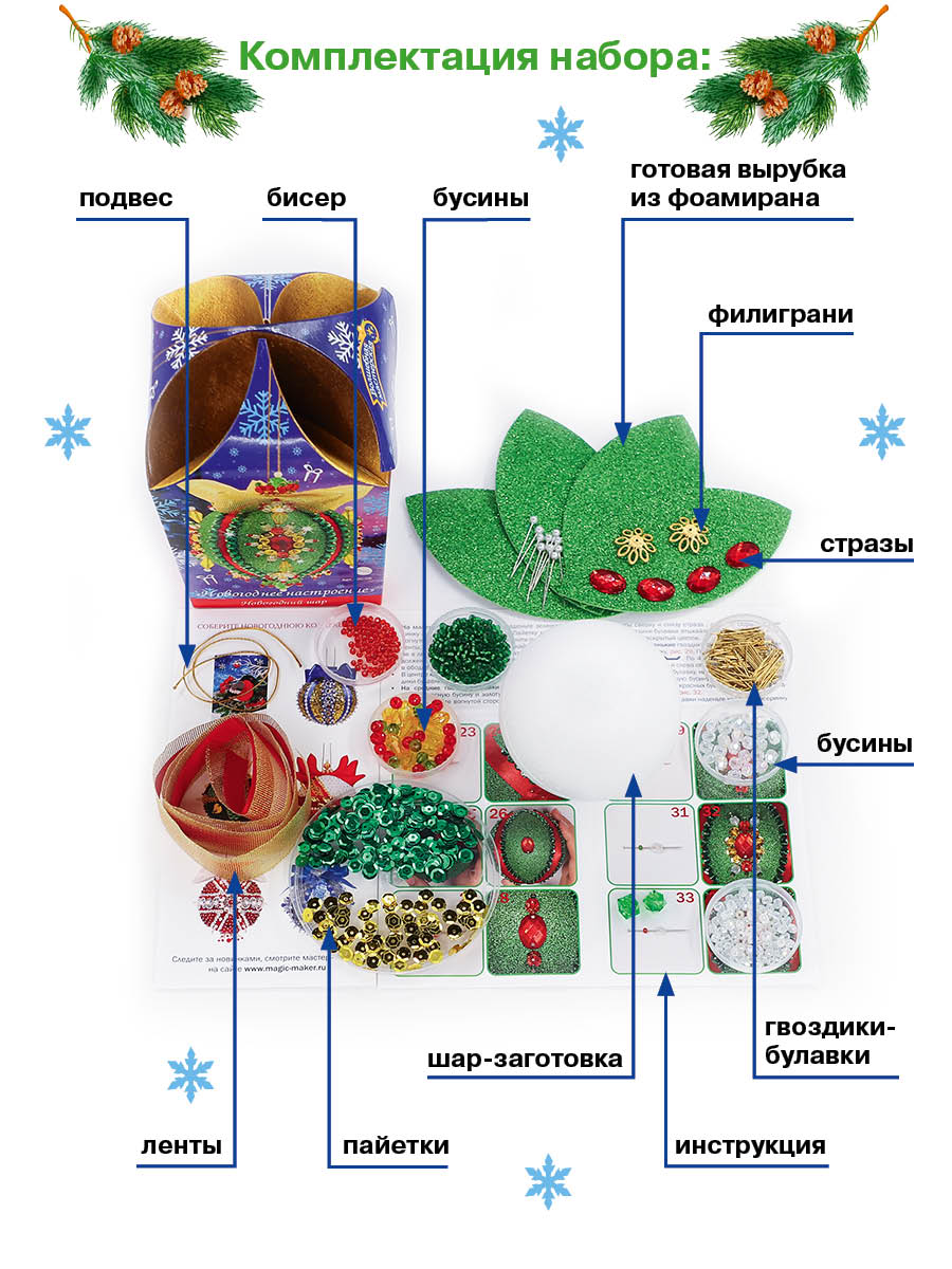 Эффектная, стильная игрушка, сделанная своими руками, станет жемчужиной любой новогодней елки или украшением интерьера, а также ярким креативным подарком близким и коллегам. Потрясающий результат не заставит себя ждать, ведь все необходимое уже включено в комплект. Творческий процесс способствует развитию фантазии, мелкой моторики, объемного мышления, чувства композиции, воспитывает аккуратность, усидчивость и внимательность. Готовьтесь заранее к самому долгожданному празднику года, создавая креативные вещицы, разработанные с любовью для Вас коллективом «ВОЛШЕБНОЙ МАСТЕРСКОЙ».