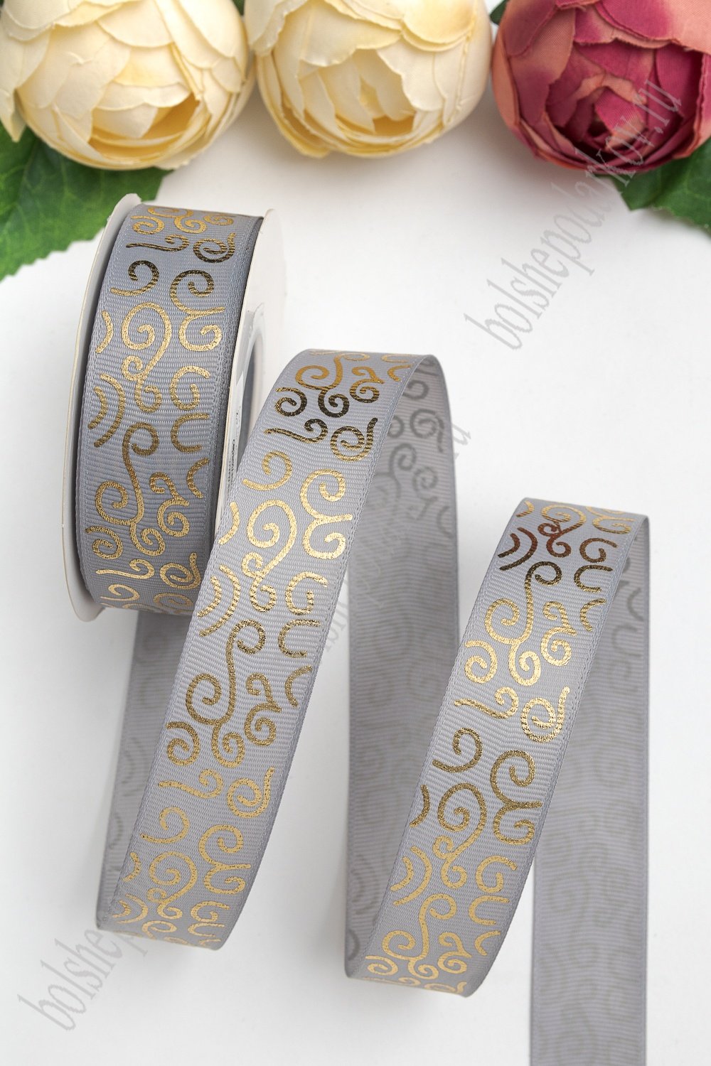Лента репсовая 2,5 см*20 ярд "Узор" SF-5852, серый/золото №03