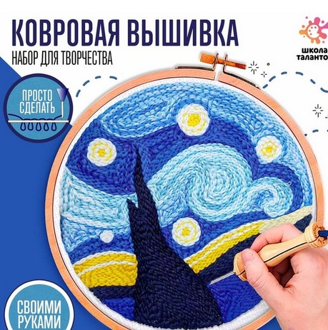 Погрузитесь в мир творчества с набором для ковровой вышивки «Ночь». Этот комплект станет отличным выбором для любителей рукоделия и креативных занятий. Особенности и преимущества набора Техника вышивки, с нанесением рисунка при помощи трафарета, позволяет легко и быстро начать работу, что особенно полезно для начинающих. Занятия ковровой вышивкой развивают мелкую моторику, концентрацию внимания и творческое мышление. Это отличный способ провести время с пользой, создавая уникальное украшение для дома или подарка для близких. Набор станет замечательным подарком для подростков и взрослых, увлечённых рукоделием. Последовательность работы Переведите картинку с трафарета на ткань с помощью света и карандаша. Можно приложить трафарет с канвой к окну и прочертить контуры рисунка. Заправьте иглу, как прописано в инструкции. Иглу нужно держать косым срезом по ходу движения, как показано на схеме. Заполните один участок нитками определённого цвета, затем следующий и т.д. Ваша картина-вышивка готова!