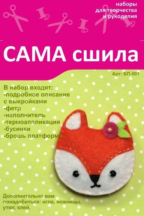 В набор входит: выкройки для создания игрушки, фетр, наполнитель, бусинки, термоаппликация, брошь-платформа.
