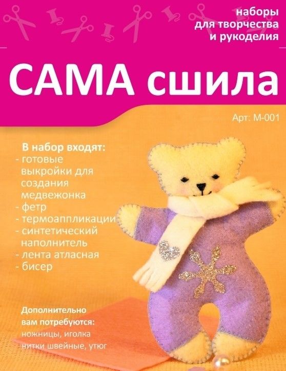 В набор входит: готовые выкройки для создания медвежонка, фетр, термоаппликации, синтетический наполнитель, лента атласная, бисер